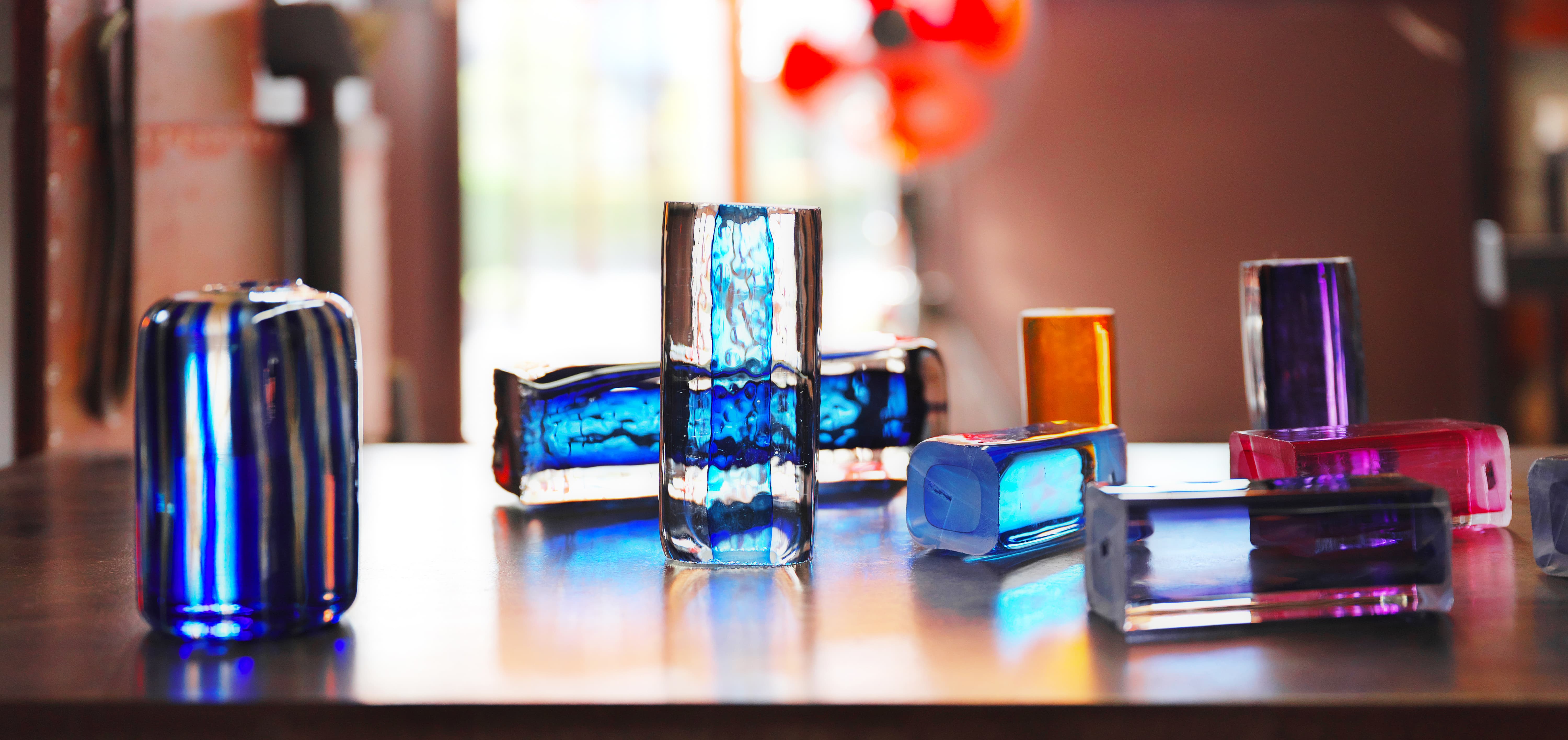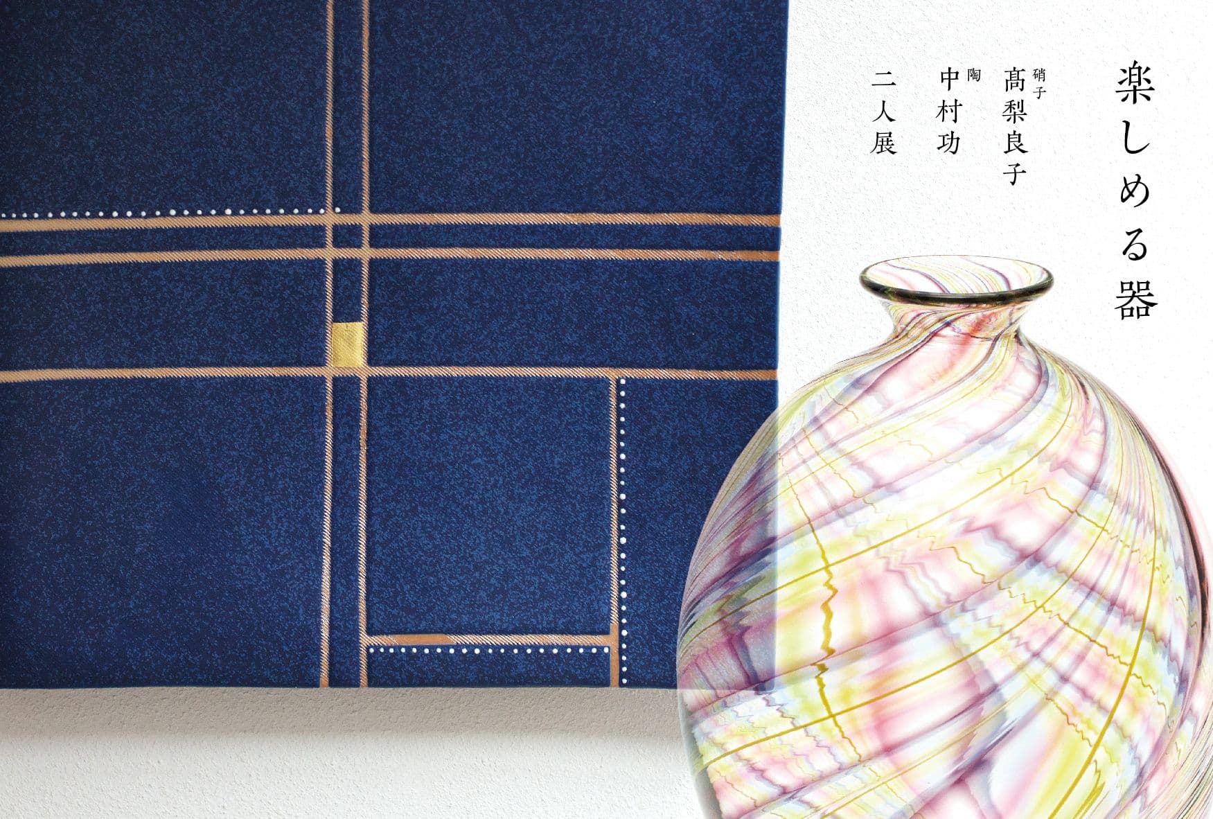 陶芸の中村功様と硝子の高梨の二人展。マットなコバルトブルーを纏うデザインされた中村様の作品と色とりどりのガラスの器たち。料理を盛り付け、酒を飲み、日常の食卓を楽しく飾る器たち。